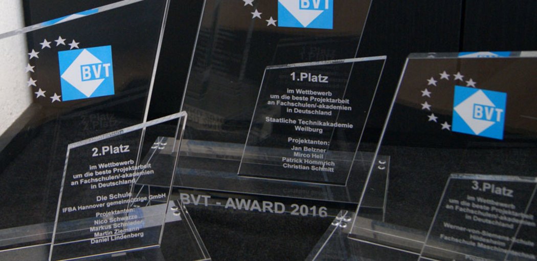 Der BVT freut sich die Gewinner des diesjährigen bundesweiten Wettbewerbes um die beste Projektarbeit an Fachschulen bzw. Akademien - dem BVT-AWARD - bekannt zu geben.